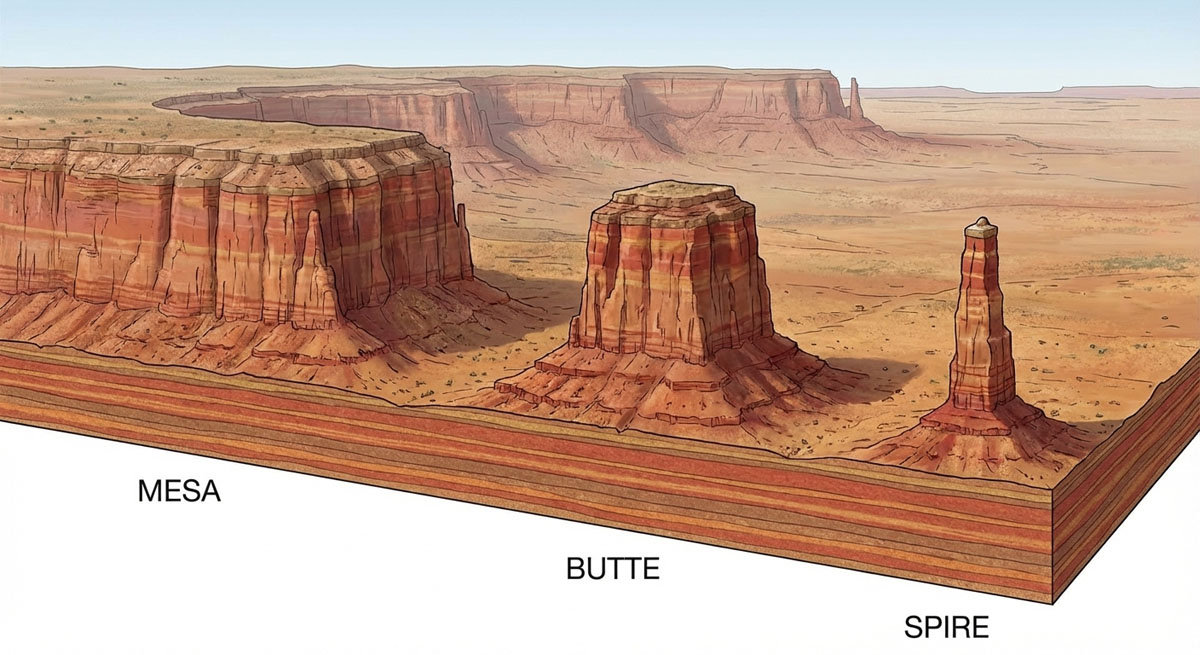 侵食により「台地」→「メサ」→「ビュート」→「スパイア」と縮んでいきます。