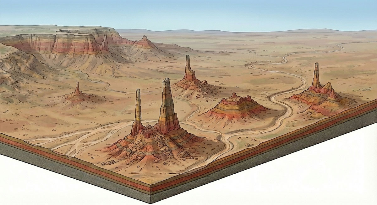 硬い地層が「傘」の役割を果たし、その下の柔らかい層を守ったため、周囲は削り取られてもそこだけが柱のように残りました。こうして、現在のビュート(岩山)が形成されたのです。