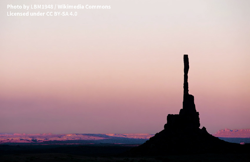 ナバホの聖なる場所の一つ。かつて広がっていた岩盤が長い年月をかけて削られ、周囲が失われた結果として残った「スパイア(岩柱)」です。モニュメントバレーの地形がたどる最終段階を象徴する存在です。