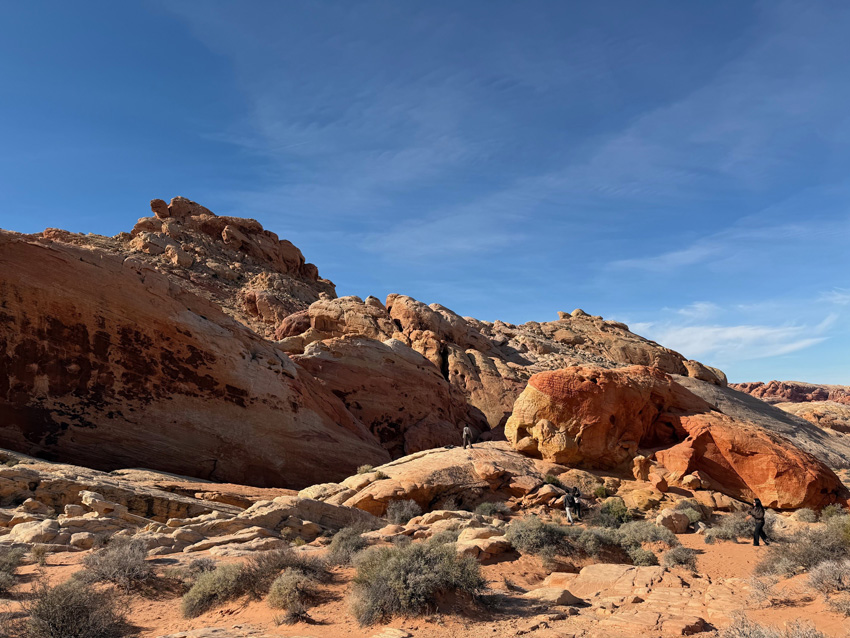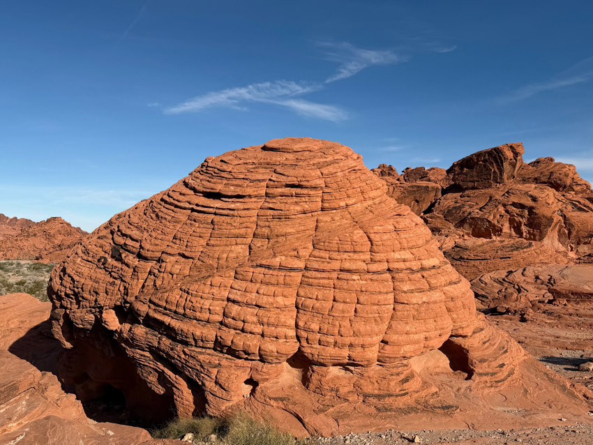 | バレー・オブ・ファイヤー州立公園に到着。 ■ ビーハイブス(Beehives) その名の通り、まるで巨大なミツバチの巣箱(養蜂箱)のような丸みを帯びた奇岩がいくつも並びます。1億5000万年前の砂漠が、断層活動によって地表に現れた神秘の奇岩。時を刻む地層の縞模様に、直接見て、触れることができるスポットです。 ■ レインボービスタ(Rainbow Vista) 公園内で最も「広がり」を感じる場所。視界を染める七色のパノラマが広がる場所、それがレインボー・ビスタの名前の由来です。遮るもののない高台に立つと、目の前に現れるのは、虹色のグラデーションに彩られた岩の大地。赤、桃、白……と色が重なり合う幻想的な景観は、まさに「地球のパレット」。 |