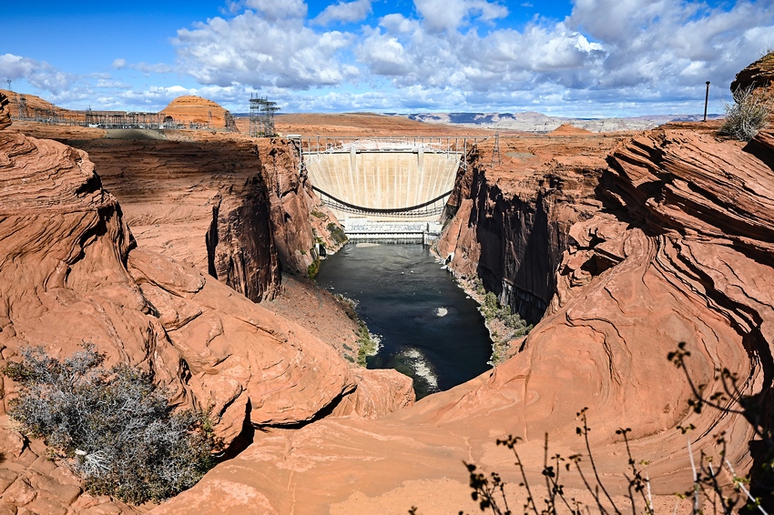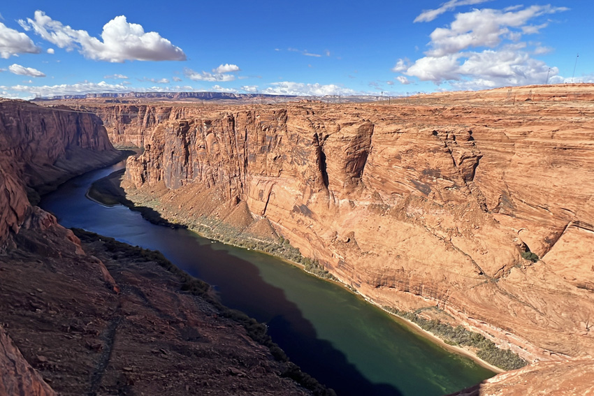 | グレンキャニオンダム・オーバールック(Glen Canyon Dam Overlook)を観光。 足元を埋め尽くすのは1億数千万年前の砂漠の記憶を留めた「ナバホ砂岩」。 波打つような縞模様や、激しい浸食が生んだ幾何学的な岩肌、眼下約150メートルを流れるコロラド川。垂直に切り立った赤い絶壁と、その間をゆったりと流れるエメラルドグリーンの川面のコントラストは、まさに息を呑む美しさです。 |